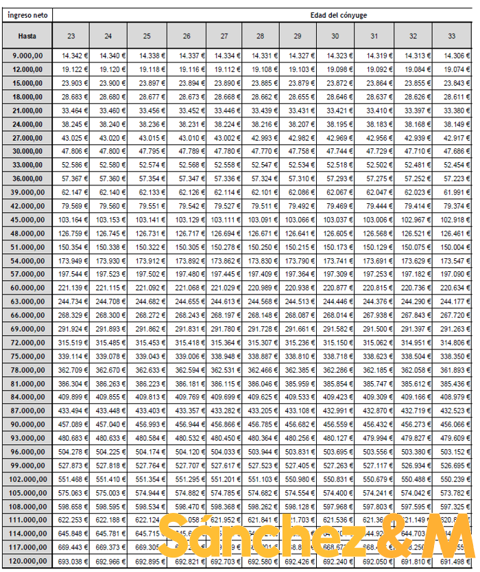 El lucro cesante en la indemnización por muerte en accidente de tráfico. Para calcular el lucro cesante de los beneficiarios de un fallecido deberemos atender únicamente a “las pérdidas netas que sufren aquéllos que dependían económicamente de la víctima”. Y esta definición de lucro cesante referida al fallecimiento hace que no todos los beneficiarios de las tablas precedentes tengan derecho a complementar su indemnización con la de esta tabla. Indica el artículo 82 del baremo de tráfico que tendrán consideración de beneficiarios de indemnización por lucro cesante el cónyuge, los hijos menores de edad y -salvo que demuestre que eran independientes económicamente- los hijos de hasta treinta años. El resto de familiares tendrá que acreditar que dependían económicamente de la víctima para tener derecho a indemnización. Los ex cónyuges, que podrán cobrar una indemnización por lucro cesante demostrando que en vida del accidentado percibían de él una pensión compensatoria, y que la misma se ha extinguido con el fallecimiento de este. Así, lo que el baremo llama “multiplicando” no son sino los ingresos netos del fallecido en accidente de tráfico, mientras que el “multiplicador” (también llamado “coeficiente actuarial”) son las cantidades contenidas en las tablas 1.c que incorpora el baremo. Y sí, he dicho “tablas”, porque existe una diferente para cada categoría de beneficiario (cónyuge, cónyuge con discapacidad, hijo, hijo con discapacidad, progenitor, hermano, hermano con discapacidad, abuelo, nieto, nieto con discapacidad, allegado y allegado con discapacidad). Un ejemplo es esta tabla correspondiente al cónyuge. |