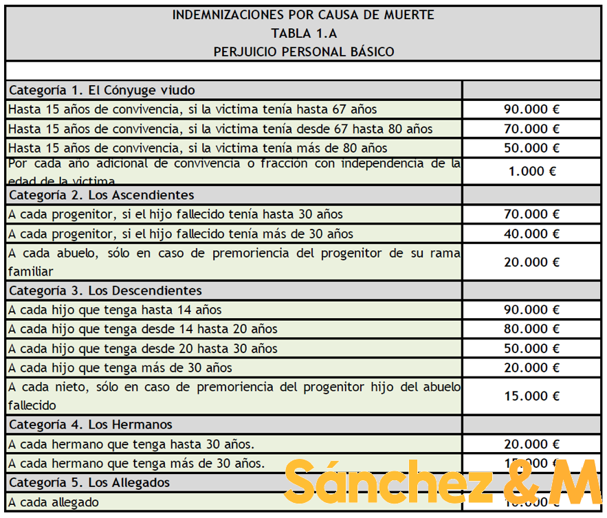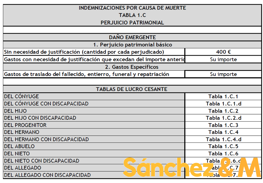 La regla del tres: Tabla 1.a Para calcular las indemnizaciones por accidente de tráfico, tanto se trate de una por fallecimiento, como en caso de secuelas o lesiones temporales, deberemos acostumbrarnos a incluir tres conceptos: 1. Perjuicio personal básico 2. Perjuicio personal particular 3. Perjuicio patrimonial, que a su vez se subdivide en: – Daño emergente – Lucro cesante Vamos a empezar a aplicar estos conceptos a la indemnización por muerte en accidente de tráfico, empezando por el PERJUICIO PERSONAL BÁSICO. El perjuicio personal básico, aplicado a las indemnizaciones por fallecimiento, es el que sufre cada beneficiario meramente por serlo, esto es, por pertenecer a una de las categorías que se incluye en la tabla.