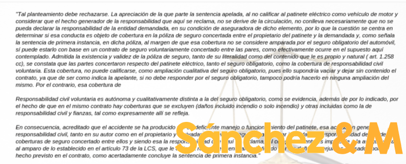 Tras haber realizado una búsqueda de jurisprudencia acerca de accidentes con patinetes eléctricos se descubre que, en la mayoría de los casos, antes de llegar a las vías judiciales, se pagan las indemnizaciones correspondes. Y, que los casos más importantes que han llegado a vías judiciales son los nombrados anteriormente. (Sigo buscando y analizando jurisprudencia acerca de ello)